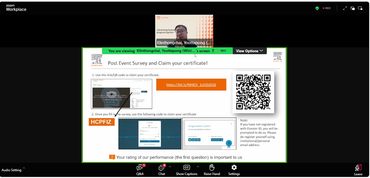 โดยเป็นการจัดอบรมออนไลน์สำหรับมหาวิทยาลัยภายใต้กระทรวงการอุดมศึกษา วิทยาศาสตร์ วิจัยและนวัตกรรม ร่วมกับ Elsevier ด้วยรูปแบบการประชุมออนไลน์ผ่านระบบ Zoom โดยมีวิทยากรได้แก่ คุณยุทธพงศ์ กลิ่นธงชัย Customer Success Manager, Elsevier มีวัตถุประสงค์เพื่อเสริมสร้างความรู้และทักษะด้านการสืบค้นข้อมูล การเตรียมต้นฉบับ และจริยธรรมการตีพิมพ์